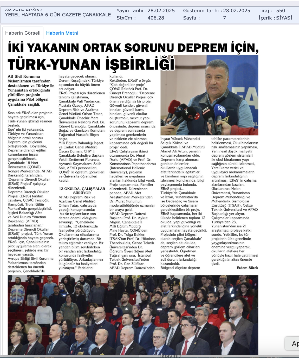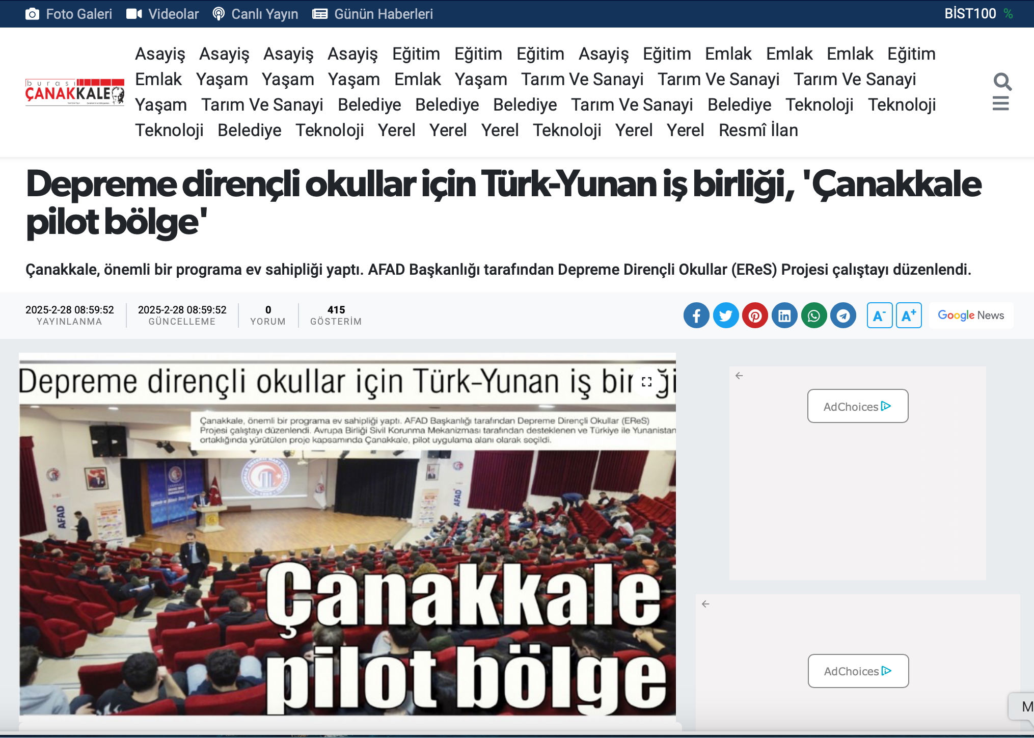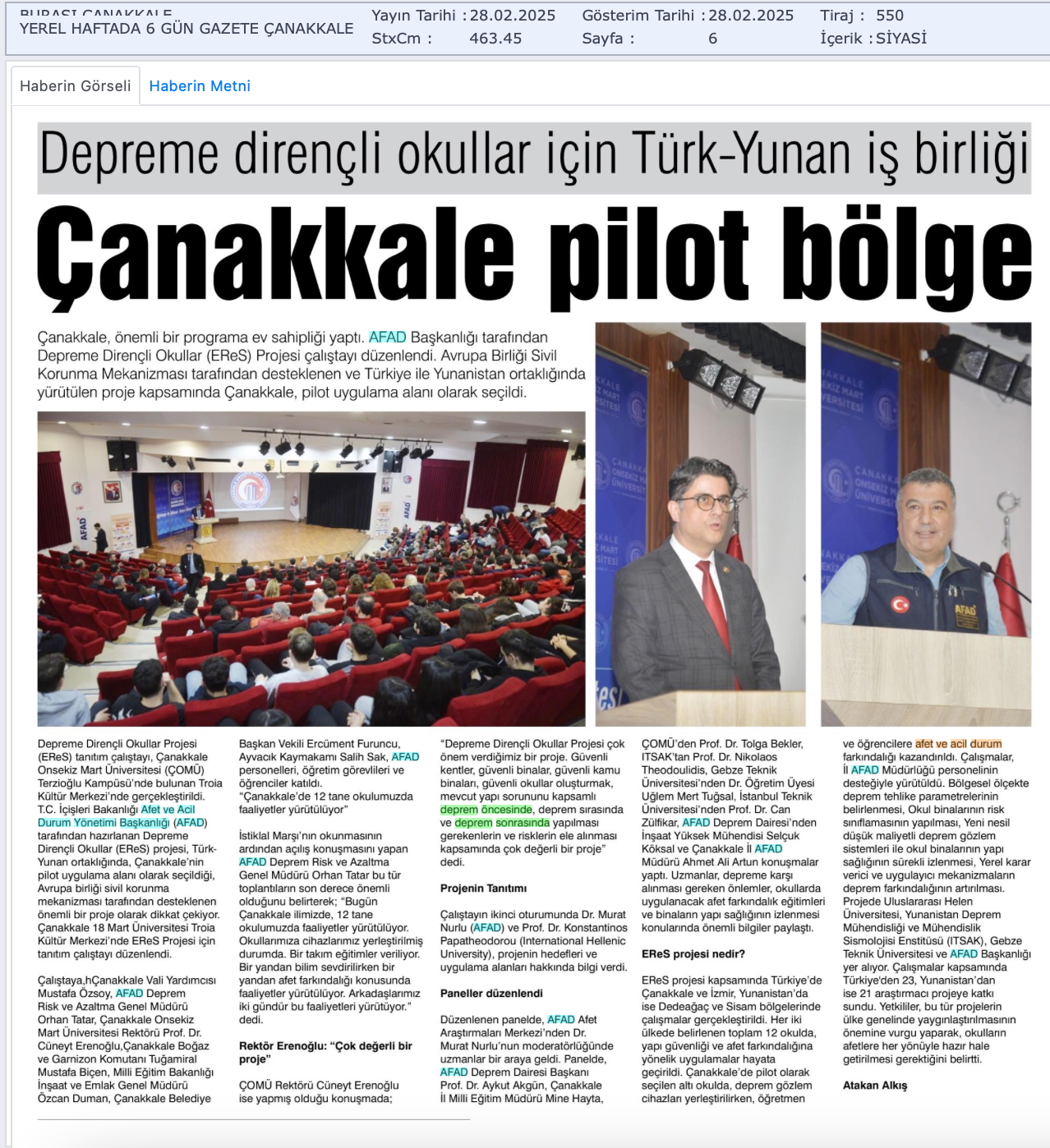 On February 27-28, 2025, a series of impactful awareness-raising events took place in Çanakkale, Türkiye, as part of the Earthquake Resilient Schools (EReS) Project. These events, organized under the project’s Dissemination and Communication activities, aimed to enhance earthquake preparedness in school communities through education, collaboration, and innovative methodologies.